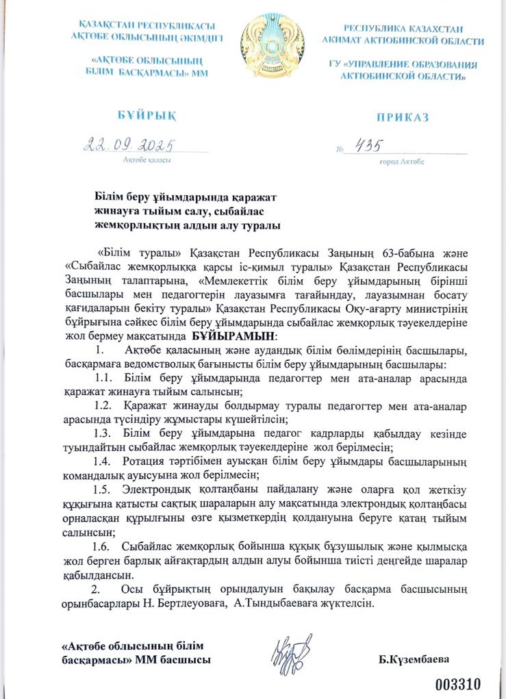 Білім беру ұйымдарында қаражат жинауға тыйым салу, сыбайлас жемқорлықтың алдын алу туралы бұйрық